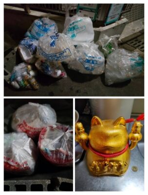 ごみ袋から招き猫と