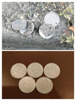 道路脇に、1円玉が