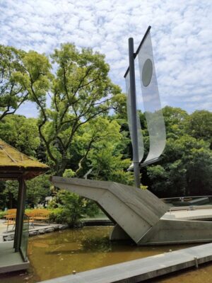 池には船のオブジェ。